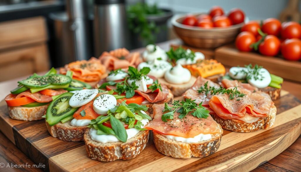 Belegte Brote mit frischem Gemüse und Saucen