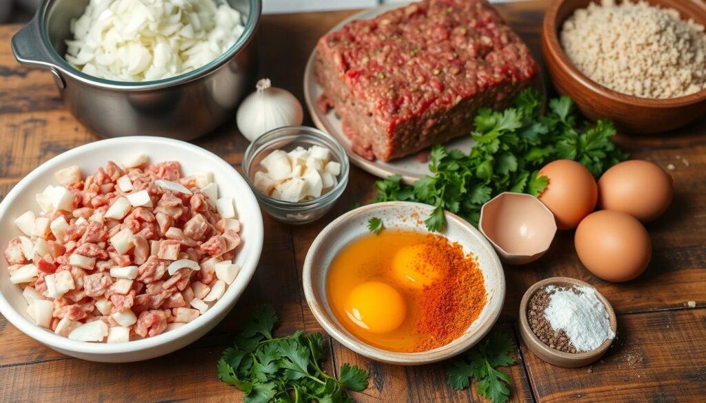 Das Hackfleisch wird zuerst gut durchknetet. So wird es gleichmäßig. Dann fügt man Ei, Paniermehl, Zwiebeln und Gewürze hinzu. So entsteht eine weiche Masse. Es ist wichtig, alles gut abzuschmecken, damit der hackbraten im ofen rezept perfekt schmeckt.