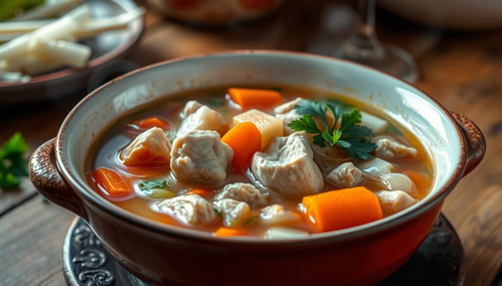 Omas Hühnersuppe ist bei vielen beliebt2. Sie schmeckt wunderbar und bietet viele gesundheitliche Vorteile. Die lange Kochzeit sorgt dafür, dass wertvolle Inhaltsstoffe in die Brühe gelangen. Das stärkt das Immunsystem, besonders bei Erkältungen23.