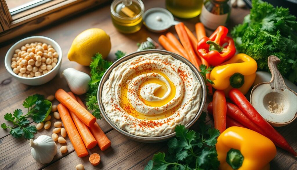 Mit diesen Zutaten machst du einen nährstoffreichen Hummus5. Kichererbsen sind voller Proteine, Vitaminen, Ballaststoffen und Mineralstoffen5. Tahini gibt dem Hummus seine cremige Konsistenz und Aroma5. So entsteht ein ausgewogener Geschmack, der an die Wurzeln des Nahost-Klassikers erinnert.