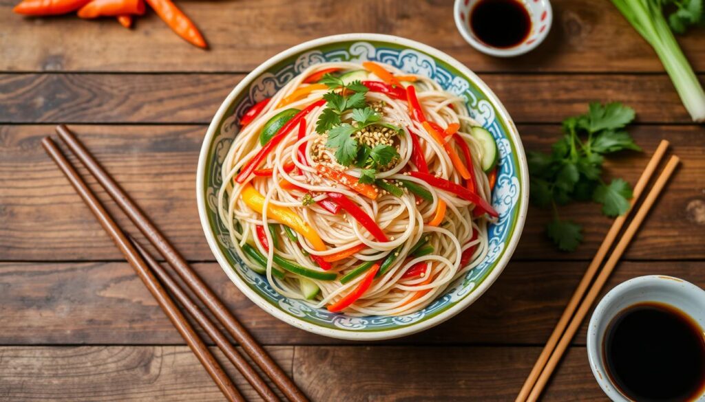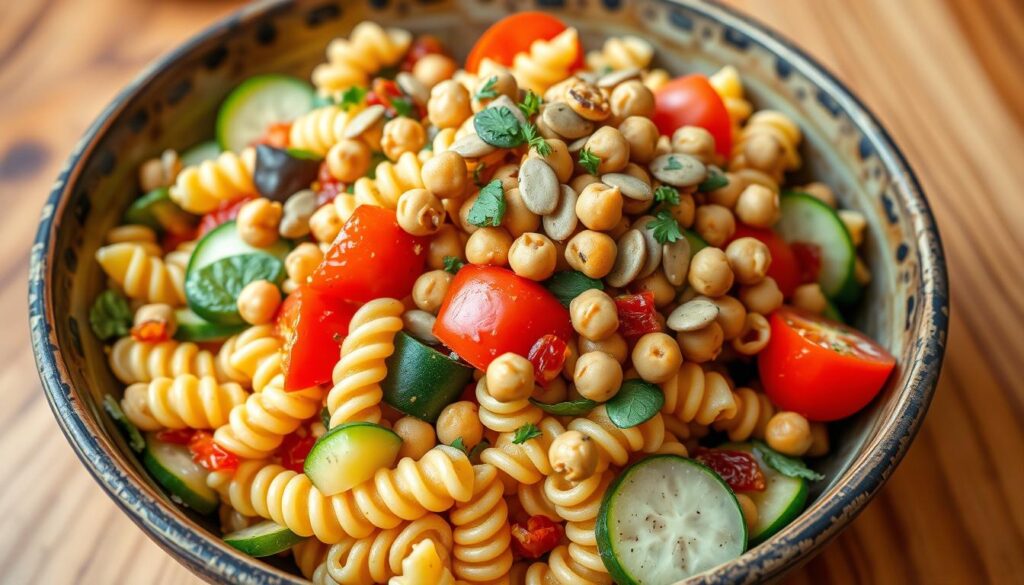Für Veganer und Vegetarier gibt es tolle Nudelsalats Rezepte. Statt Fleisch oder Käse nutzt man Kichererbsen, Tofu oder Tempeh als Proteinquelle13. Das Dressing wird aus Sojamilch, Zitronensaft, Senf, Öl und Gewürzen gemacht13. Für Knusprigkeit sind geröstete Nüsse, Samen oder Croutons ideal.