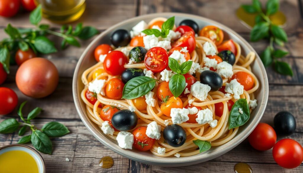 Mediterraner Nudelsalat mit Tomaten und Feta