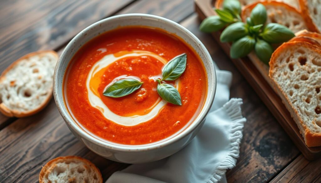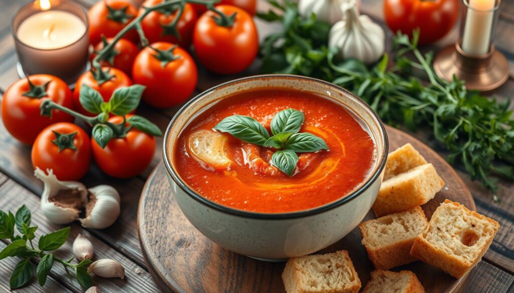 Für eine leckere Tomatensuppe brauchst du vor allem reife, frische tomaten suppe zutaten. Dosentomaten für tomatensuppe sind auch eine gute Wahl, wenn frische Tomaten nicht verfügbar sind1. Die richtigen gewürze tomatensuppe sind wichtig, um den Geschmack zu verbessern.